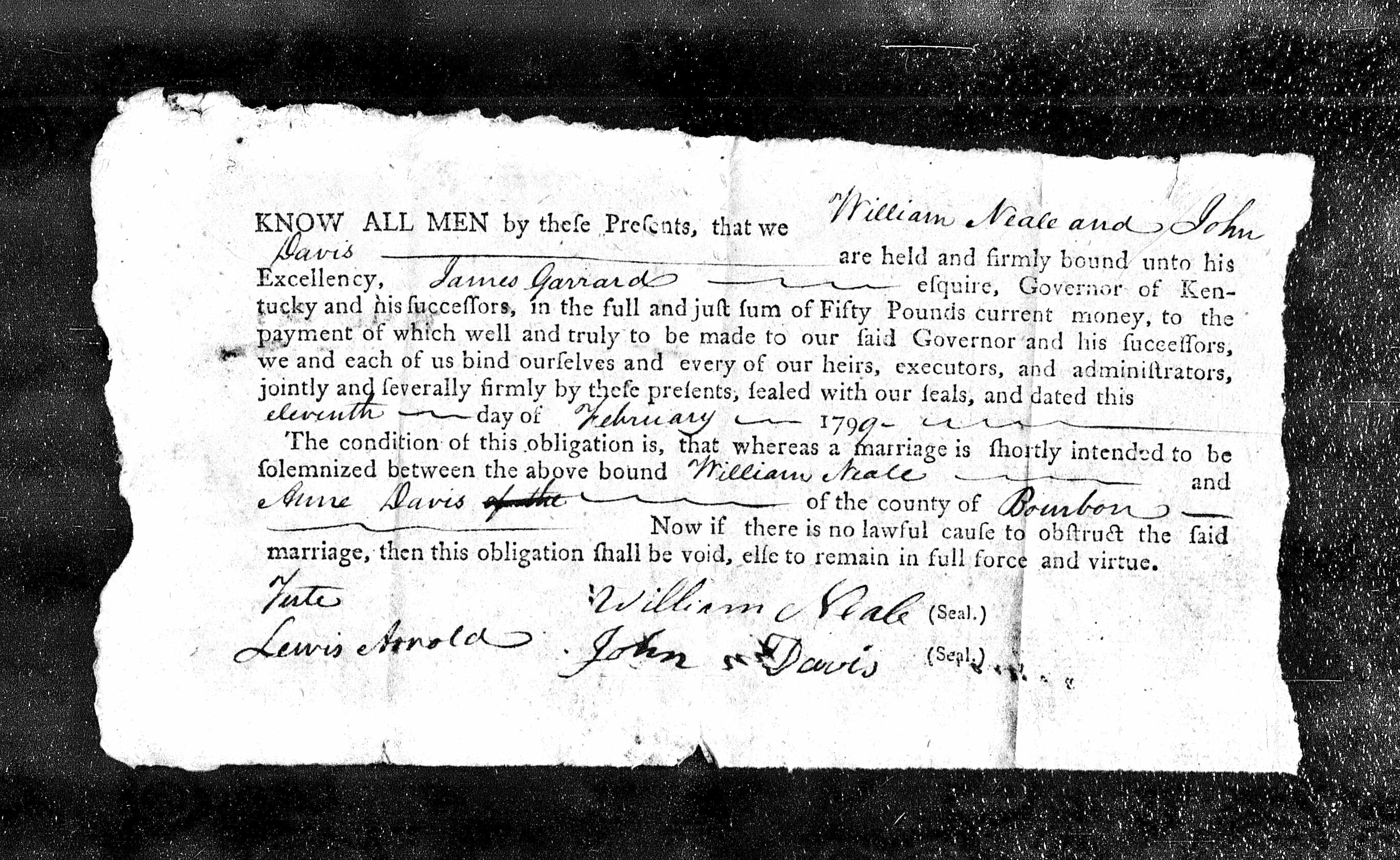William Neale (with an “e” on the marriage record) married Anne Davis on February 11, 1799 in Bourbon County, Kentucky. The bondsman was John Davis, possibly Anne’s father, brother or uncle. John Whitaker is the minister (Methodist).