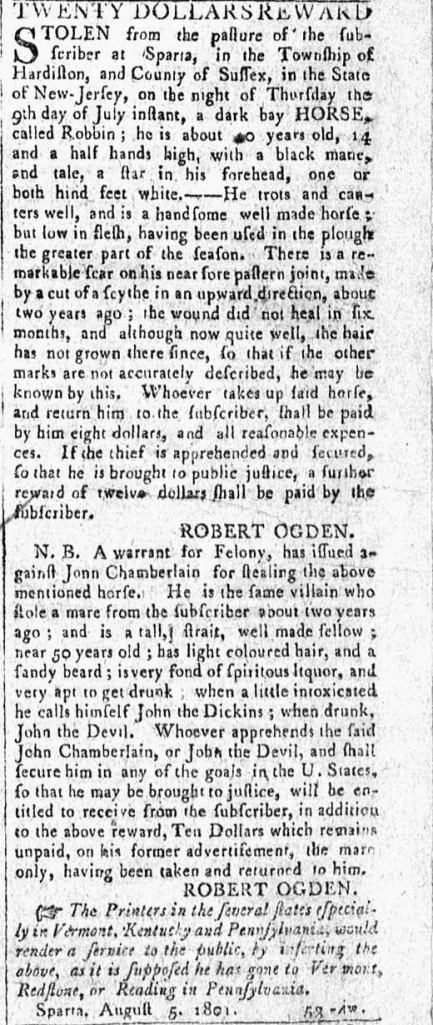 How do I know? Because John Chamberlain says so in a letter he wrote in 1814 (see PDF here, from NJ Archives in Trenton, #650 AM, “Petition of John Chamberlain to the Governor and Legislative Council requesting a pardon, November 1, 1814.” Note this is from the NJ State records, not Sussex County records – it’s in the NJ Legislature files.) Read about how he got sent to the New Jersey State Prison in the 1809 portion of the timeline.