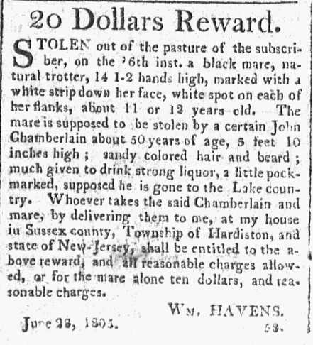 - He took a horse from his brother, Benjamin Chamberlain (of Hardyston), thereby proving John and Benjamin are brothers.